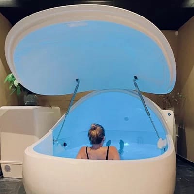 In een floatcabine, ook bekend als isolatiecabine, lig je op je rug in water dat verzadigd is met een hoog gehalte van epsom zout.